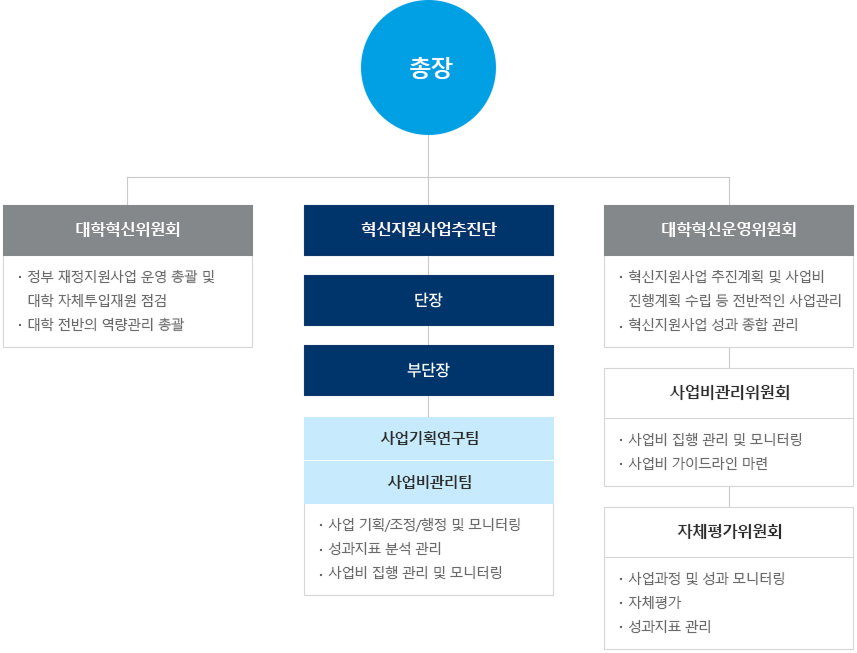 - [대학혁신운영위원회] 산하에는 사업비관리위원회와 자체평가위원회를 구성하여 사업비 집행 및 사업 성과관리를 면밀히 진행