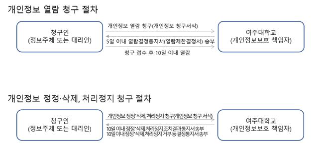 또한, 여주대학교는 관련 법령에서 규정한 바에 따라 여주대학교에서 보유하고 있는 개인정보에 대한 열람청구권 및 정정청구권 등 여러분의 권익을 존중하며, 이용자 여러분은 정보주체로서 이러한 개인정보 보호 관련 권리를 행사할 수 있습니다.